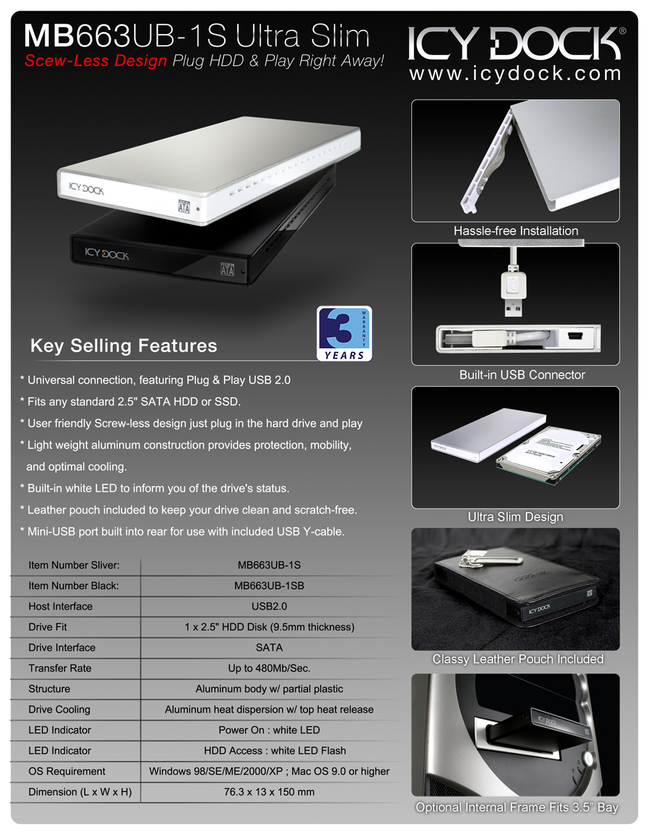 | Icy Dock MB663UB-1SB-1 / 2,5" (6,4cm) / Ultraflach / integrierter USB 2.0 Anschluss / Schwarz |