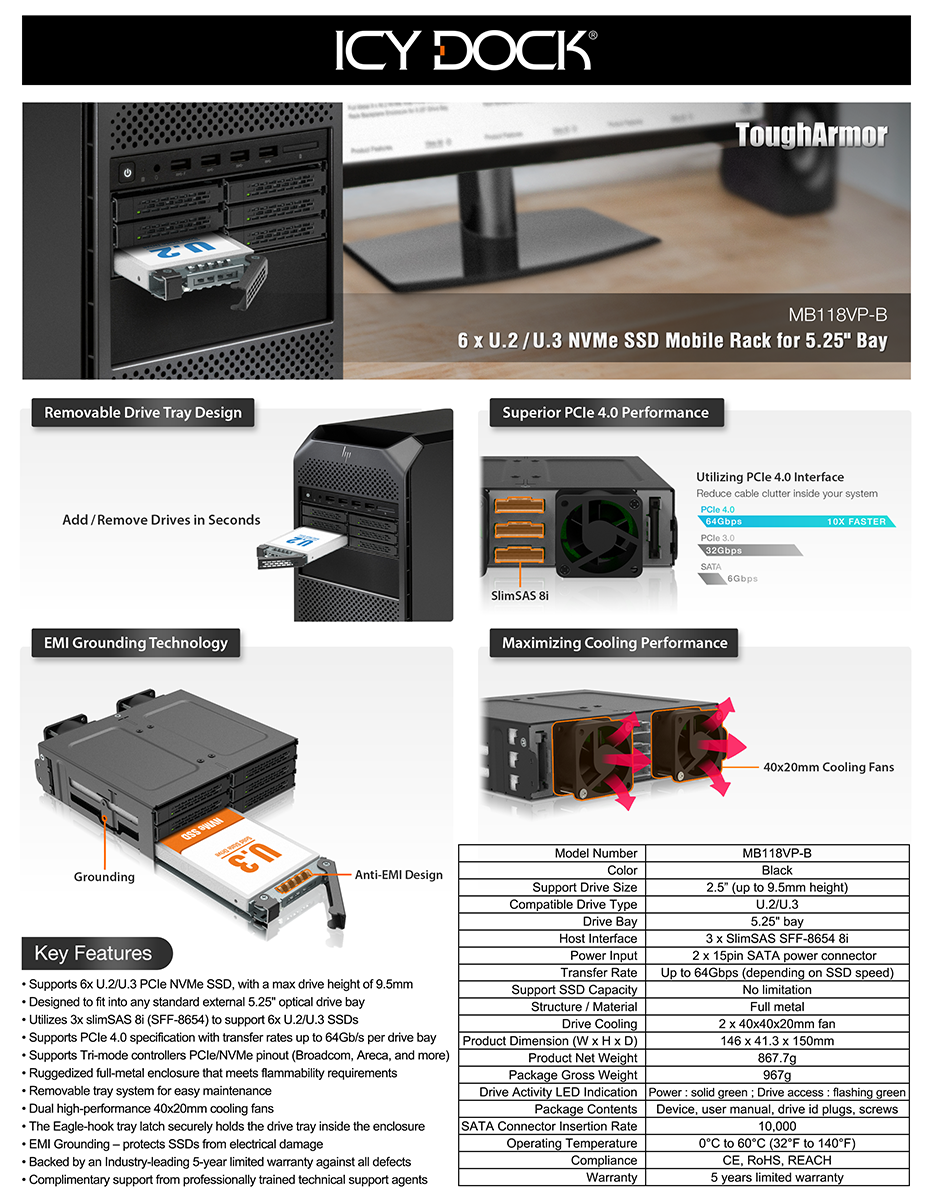 Der ToughArmor MB118VP-B ist ein robuster Wechselrahmen mit sechs Einschüben, der für U.2/U.3 NVMe SSDs entwickelt wurde. Er unterstützt Laufwerke mit einer Bauhöhe von bis zu 9,5mm und bietet PCIe 4.0-Geschwindigkeit, die über eine SlimSAS (SFF-8654)-Schnittstelle blitzschnelle Datenübertragungsraten von bis zu 64Gbps ermöglicht.
