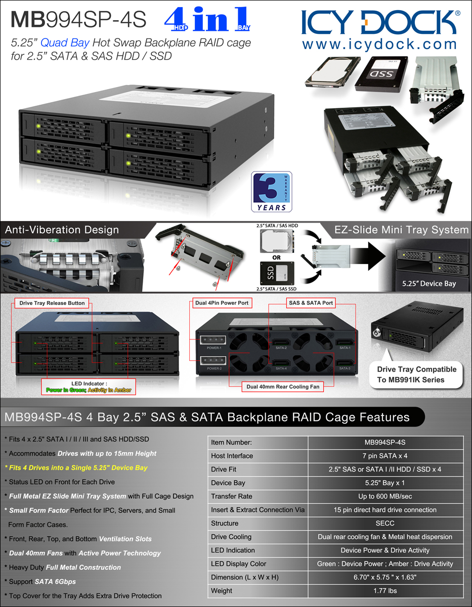* Nimmt 4x 2,5" SATA I/II/III und SAS HDD/SSD auf